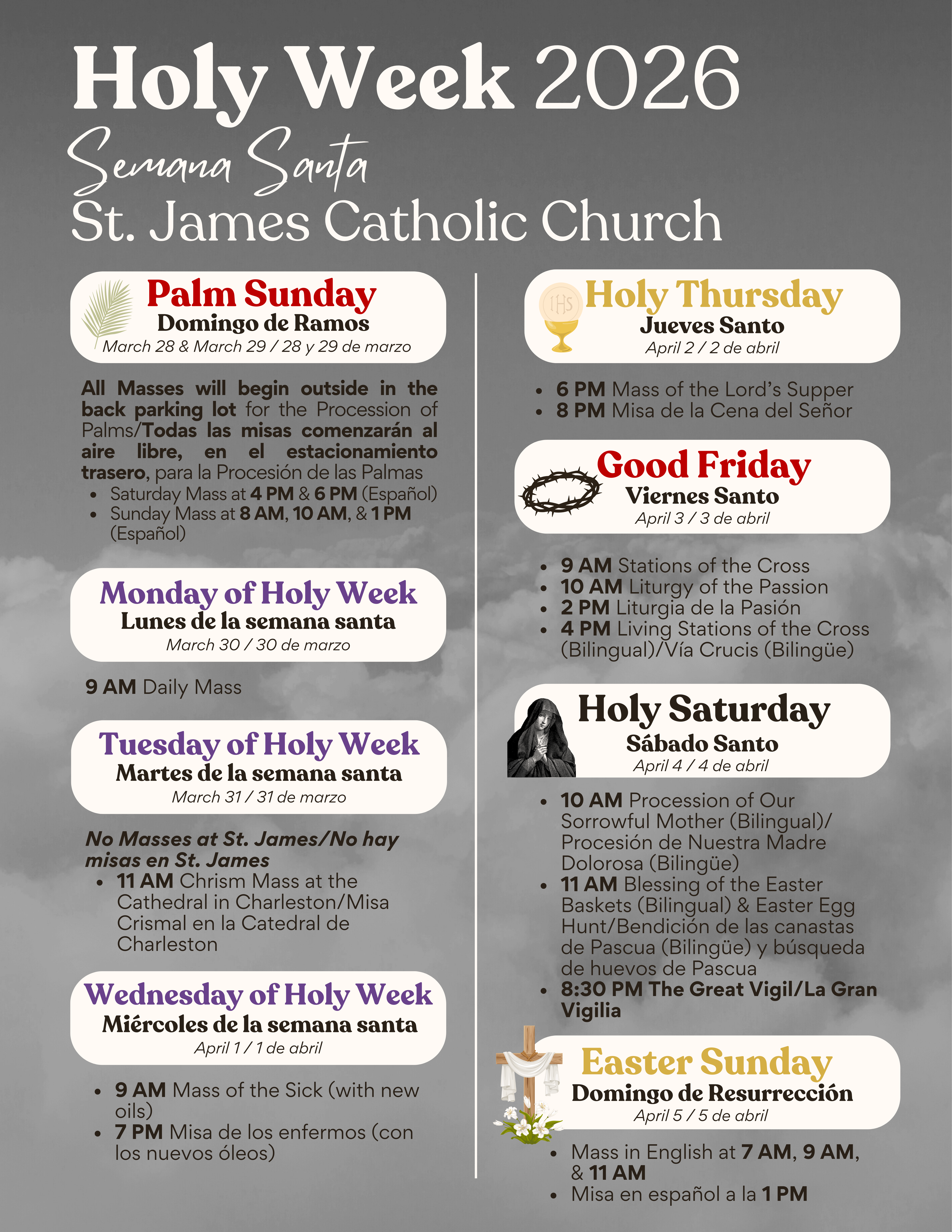 - Sunday: 8:00 AM, 10:00 AM, & 1:00 PM (Spanish)
